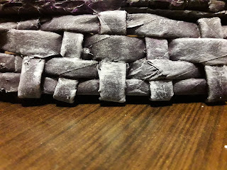 Esta segunda pieza es la tapa de una cajita realizada en papel de diario arrollado, trenzado y pintado.